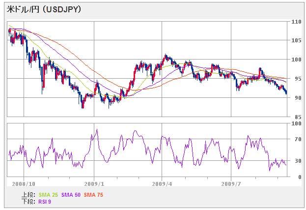 まず注目なのは、2009年7月13日の1ドル91円73銭の為替レートを割ってさらに円高となっていることです。